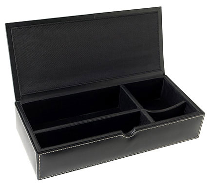 flip top closure | metal engraving plate | 4 divided compartments | holds 3 x 3 notepad, pens, pencils, scissors, staples, etc.