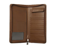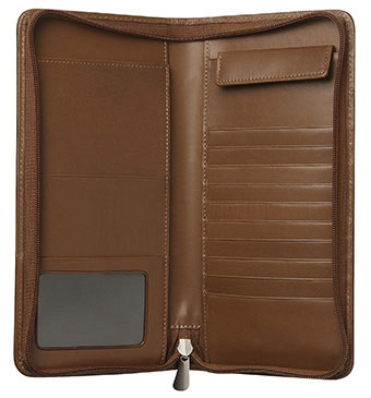 zippered closure | clear id window | pockets for passport, ticket, and travel documents | zippered currency pocket | 10 card slots | removable traveler’s check holder